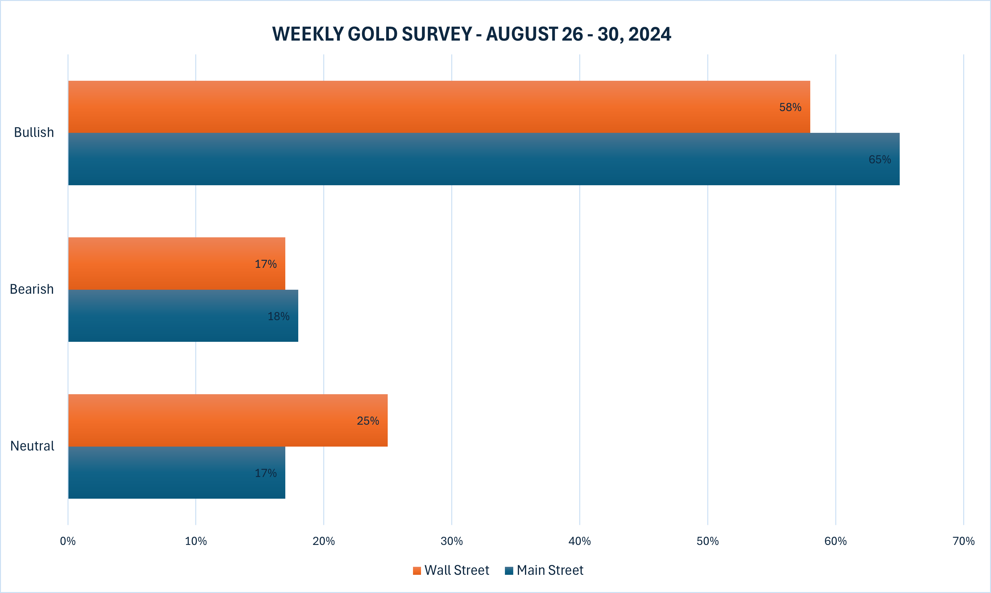 本周,共有12位分析师参与了黄金调查,其中58%的华尔街专家预期黄金价格将在下周上涨,17%的分析师看跌,剩余25%的专家预测黄金价格将横盘整理。与此同时,225位散户投资者参与了在线调查,其中65%的散户看涨,18%看跌,17%预期价格将横盘整理。