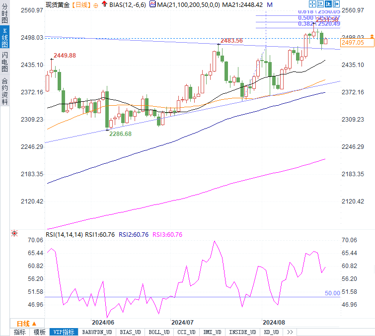 现货黄金延续了日内的涨势,重返2500关口上方,至2500.90美元/盎司,日内攀升超过16美元。近期的市场波动主要受到了美联储政策预期的影响,尤其是市场对美联储主席鲍威尔在杰克逊霍尔年会上的讲话充满期待。
