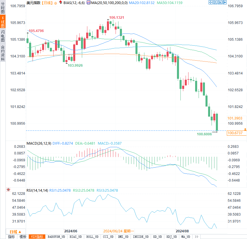 美元指数持续下跌,周五跌至1月以来的最低点,报100.82,跌幅0.72%。美联储主席鲍威尔在杰克逊霍尔年会上表示,美联储对通胀回归2%的信心增强,并暗示美联储可能在9月进行降息,甚至对降息50个基点持开放态度。这一言论几乎为美联储历史性的抗通胀行动画上了句号,市场对美联储放松货币政策的预期迅速升温。