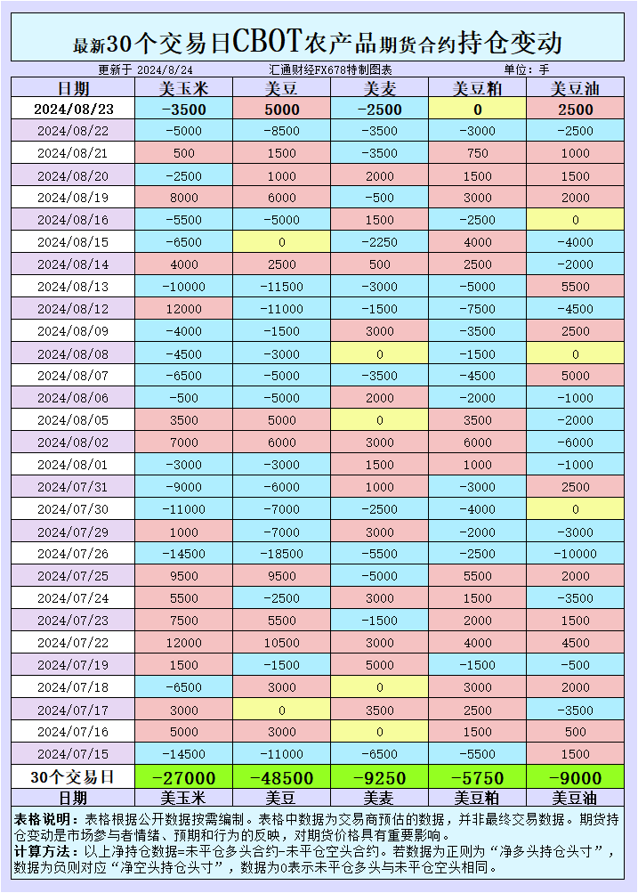 小麦市场在8月23日表现出下行压力,特别是CBOT小麦的投机性净空头增加,反映出市场对小麦价格的悲观预期。美国南部平原硬红冬小麦的现货报价保持稳定,但由于期货价格跌至低点,农民的销售兴趣受到抑制。