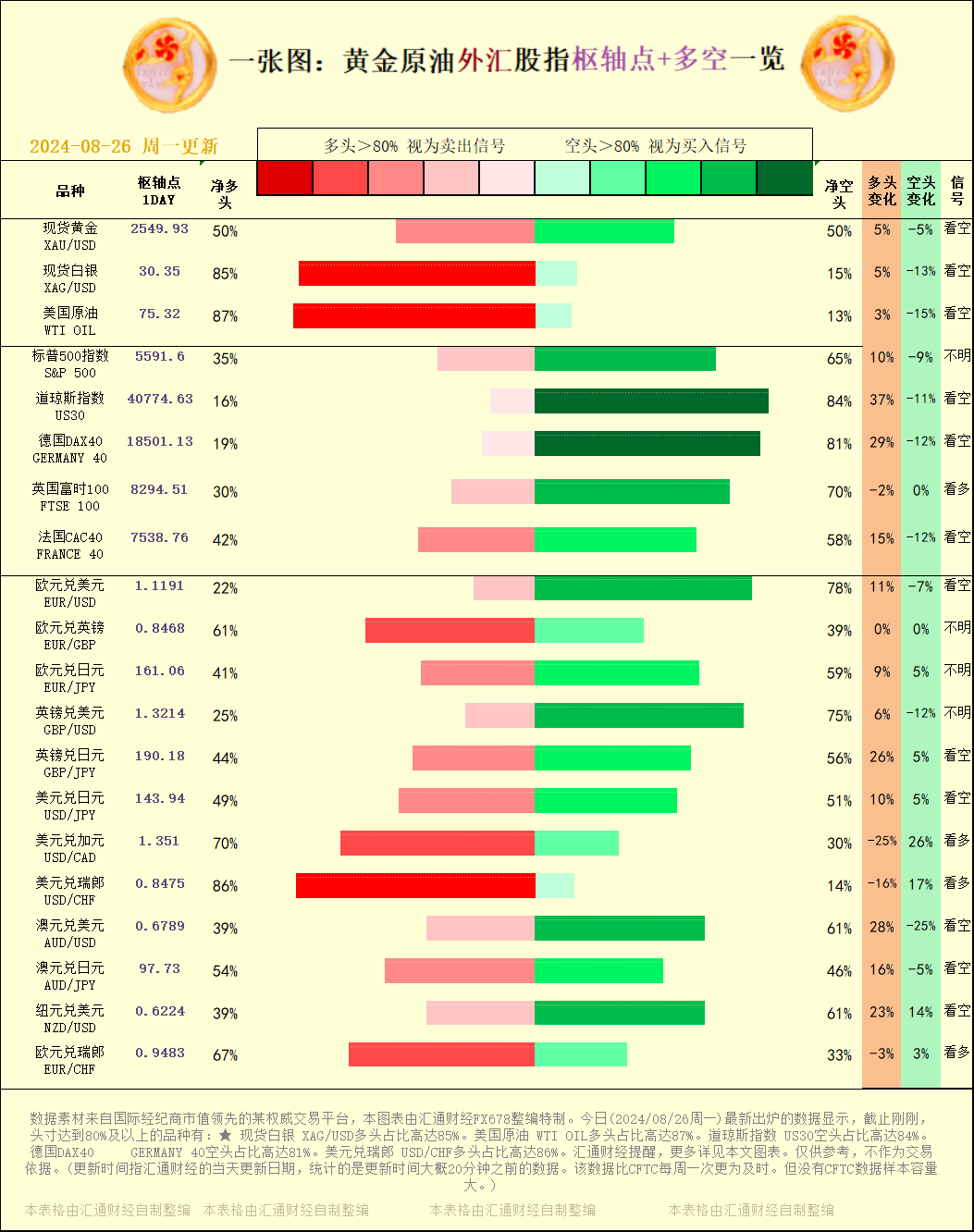 标题:一张图:2024/08/26黄金原油外汇股指"枢纽点+多空占比"一览