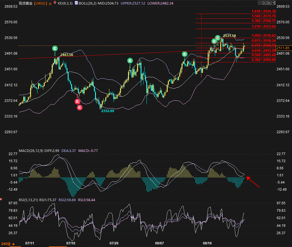 4小时图的最后两根K线(大阳线后小阳线),以及MACD刚好出现金叉,也都是积极的信号。4H图在上周行情的涨跌逆转中也发挥了重要作用,历史新高2531.58刚好触碰布林带上轨而后转为下跌,布林带中轨也在期间充当了两次支撑作用,大跌后低点2470之后的一根阳孕线也是依托4H图的布林带下轨切入位。另外,回顾上周的每个涨跌的高低点,基本完美贴合了我们8月18日开盘前文章中提醒的斐波那契扩展位,如下图可以看到,金价高低点基本都止于这些扩展位水平。这意味着,金价后市的支撑阻力还可以继续关注该斐波那契扩展位,特别是若金价再次刷新历史高位将会在哪里。