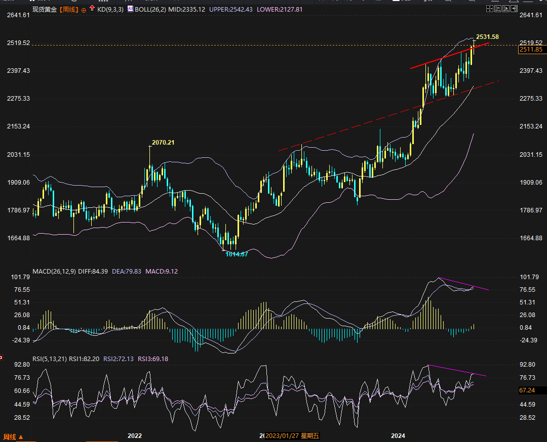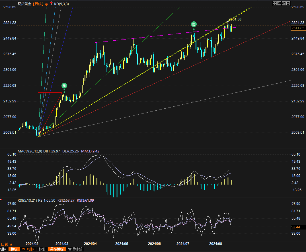 汇通财经APP讯——上周(0818-0823当周),金价按照“小跌—急涨—大跌—回升”的模式展开,一周下来虽仅收涨0.20%至2511.85美元/盎司,但其再创历史新高至2531.58后的回踩测试成功:金价上周五大阳线刚好抹平上周四大阴线,稳稳地收于此前破位的阻力线(下图粉红线阻力已确认变支撑)。从日图目前情况看,多头依然稳坐江山,多头可能继续上探如图黄色阻力线。