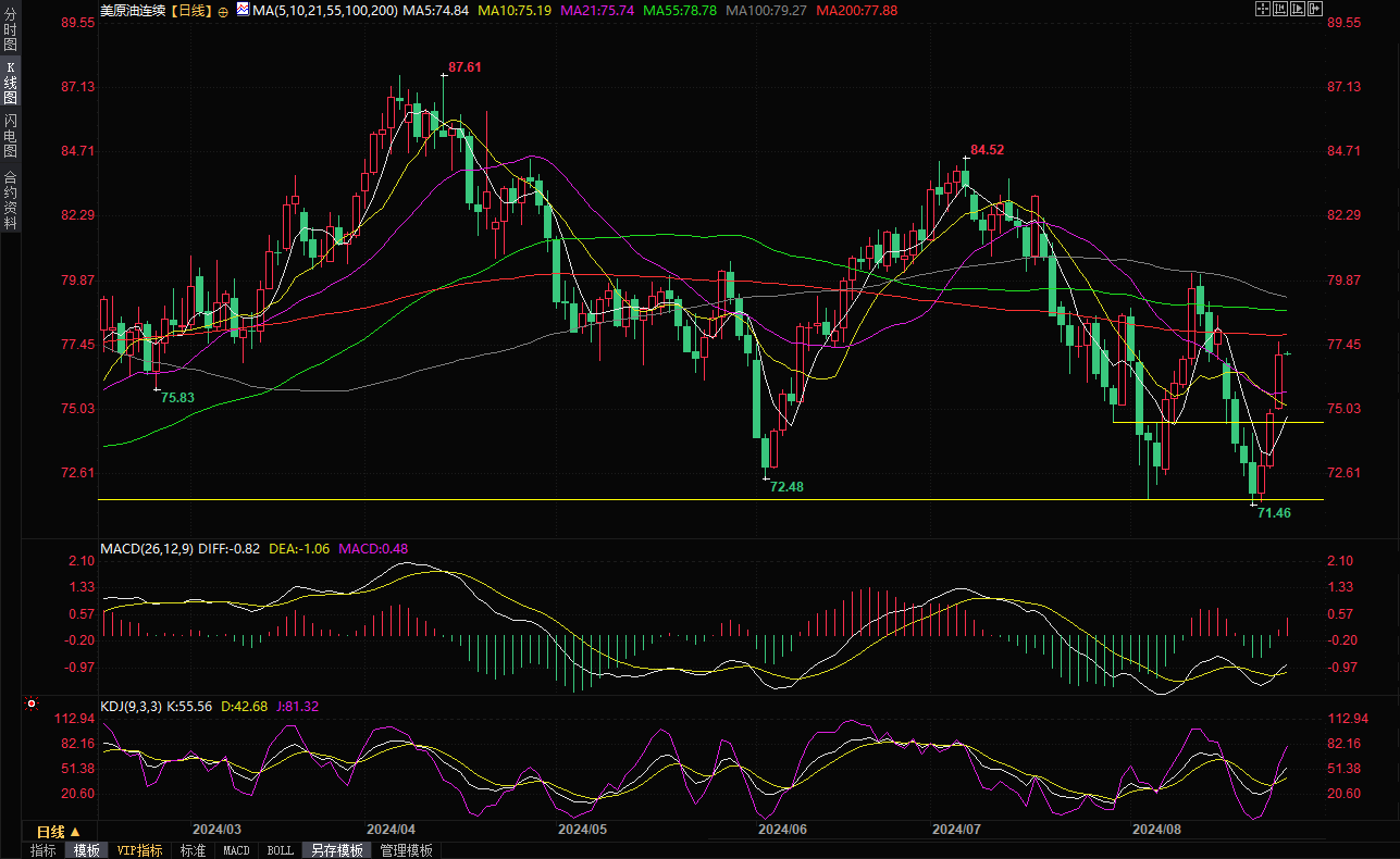 布伦特原油10月期货周一收高2.41美元,或3.05%,报每桶81.43美元;美国原油期货主力合约周一收高2.59美元,或3.5%,结算价报每桶77.42美元,200日均线阻力在77.88美元/桶附近。两大指标原油期货上周五都上涨2%以上。