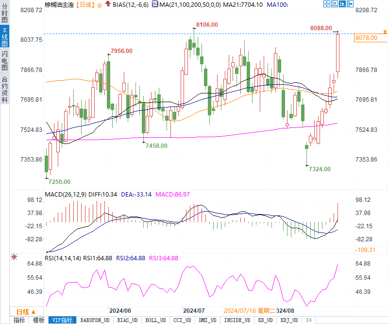 油粕市场的走势也对棕榈油价格产生影响。大连期货交易所主力豆油期货上涨1.69%,棕榈油期货上涨3.67%,芝加哥期货交易所豆油期货价格上涨0.12%。这些油脂类产品的价格波动也为棕榈油价格提供了支持。