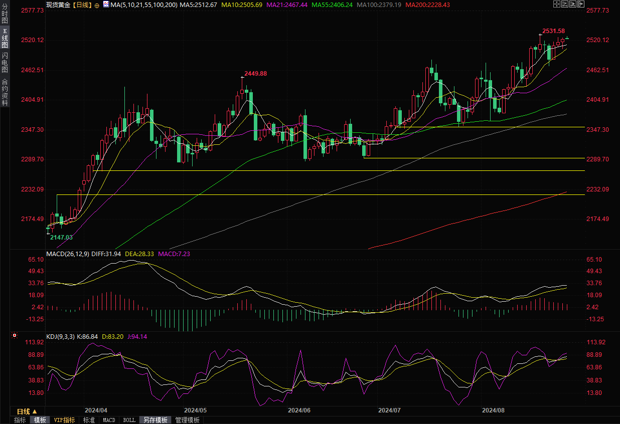 现货黄金震荡上涨,再度逼近历史高点,目前交投于2525.35美元/盎司附近。金价周二在美元走软的推动下上涨0.26%,收报2524.44美元/盎司,