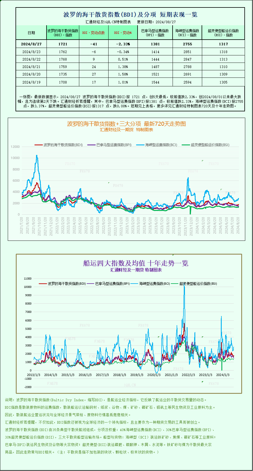 汇通财经APP讯——最新数据显示,2024/08/27波罗的海干散货指数(BDI)报1721点,创5天最低,较前值跌2.33%,创2024/08/01以来最大跌幅,且为连续第2天下跌。其中,巴拿马型运费指数(BPI)报1381点,较前值跌2.33%,海岬型运费指数(BCI)报2755点,跌3.37%,超灵便型船运价指数(BSI)报1317点,跌0.08%。波罗的海干散货指数+三大分项的最新720天走势图、十年走势图等详见汇通财经特制图表。