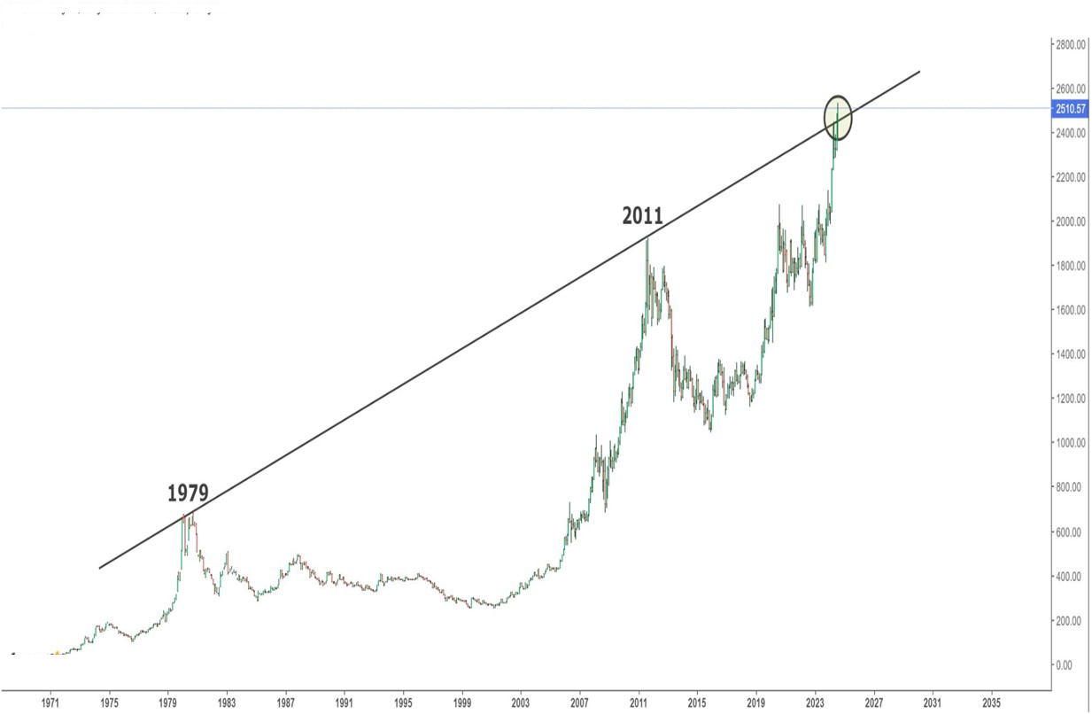 他写道:“在过去的50年里,黄金经历了两个主要的峰值——1979年和2011年,但在金价最近突破了间隔32年的两个顶部连接的趋势线之后,2024年才加入了这个俱乐部。”他分享了一张图表,显示黄金突破了45年的历史趋势线。