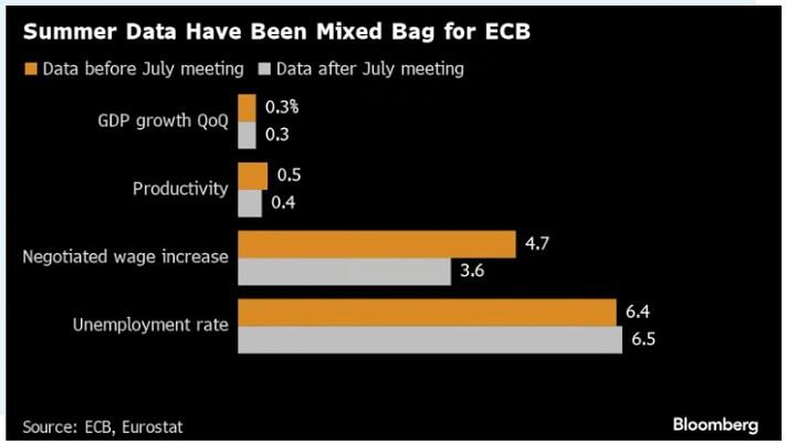 图:对于欧洲央行来说夏季数据喜忧参半(黄色是7月会议前的数据,白色是7月会议后的数据)
