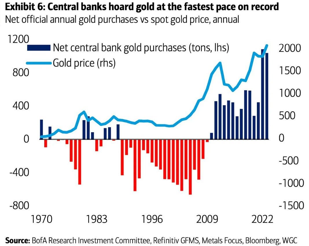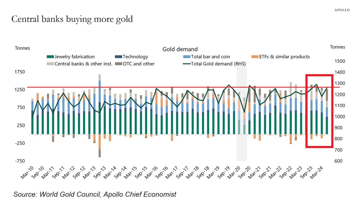 过去三年,黄金总需求在1200至1300吨之间波动,主要原因是两类买家,即亚洲实物黄金投资者和央行,后者从未像过去两年那样购买过这么多黄金。
