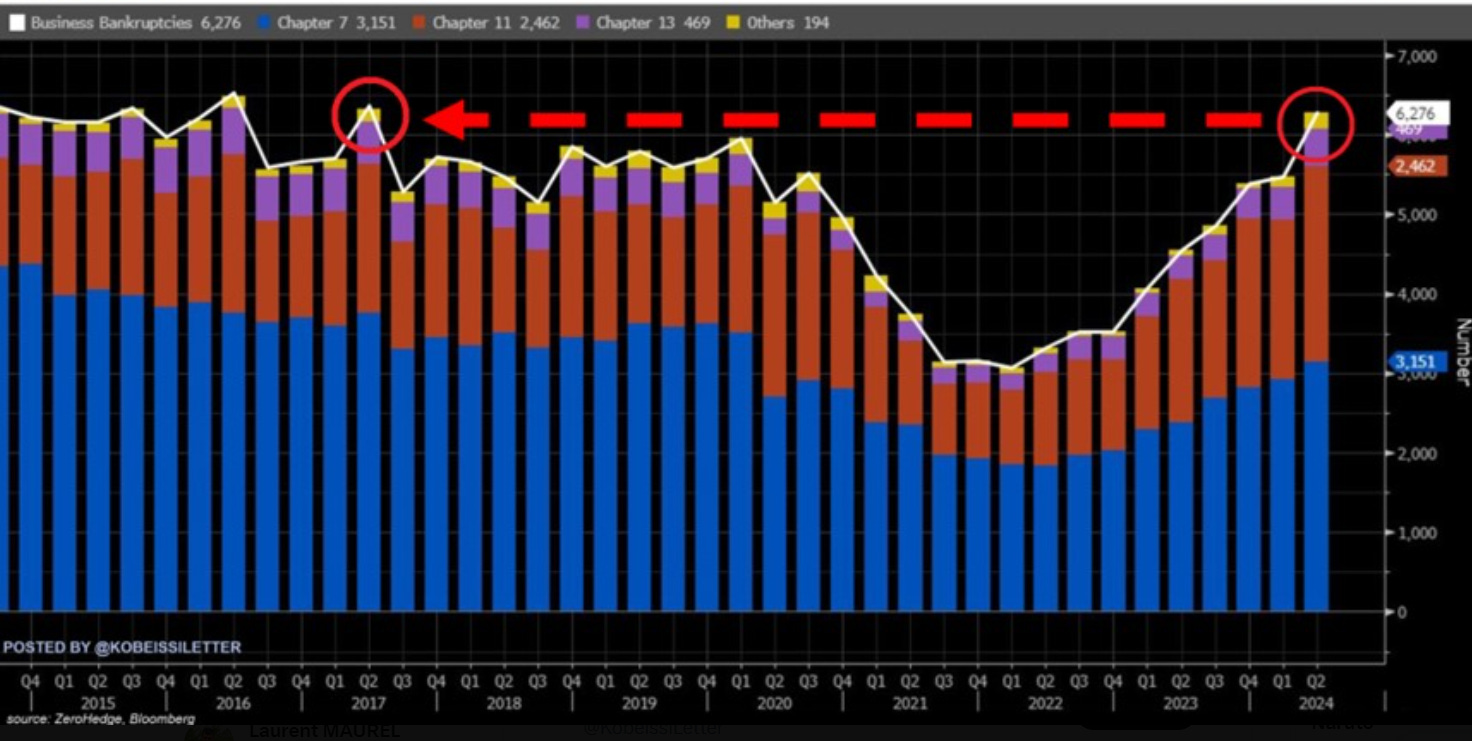 2024年第二季,美国新增破产案件达到6276起,为2017年以来的最高水平。企业破产数量在两年内翻了一番。第7章(清算)申请攀升至3151起,为2020年疫情以来的最高水平。第11章破产允许公司继续运营,同时制定重组计划,在特定时期内偿还部分或全部债务,该破产案件达到2462起,超过了过去十年的所有其他季度。第13章和其他破产案件也有所增加。第13章允许债务人在三到五年内制定还款计划,并根据可用收入定期向债权人付款。破产案件的增加,尤其是由于贷款违约,表明了一种令人担忧的趋势,让人想起了经济大衰退: