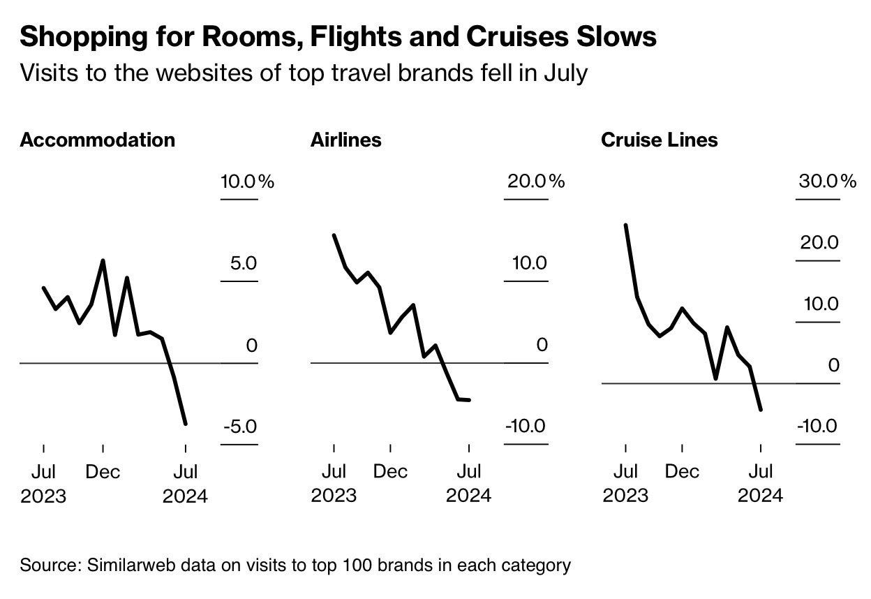 随着2024年夏季即将结束,美国正面临破产率上升和休闲活动明显减少的局面。夏季末期对需求方面不利,旅行社网站上的搜索指标就是明证: