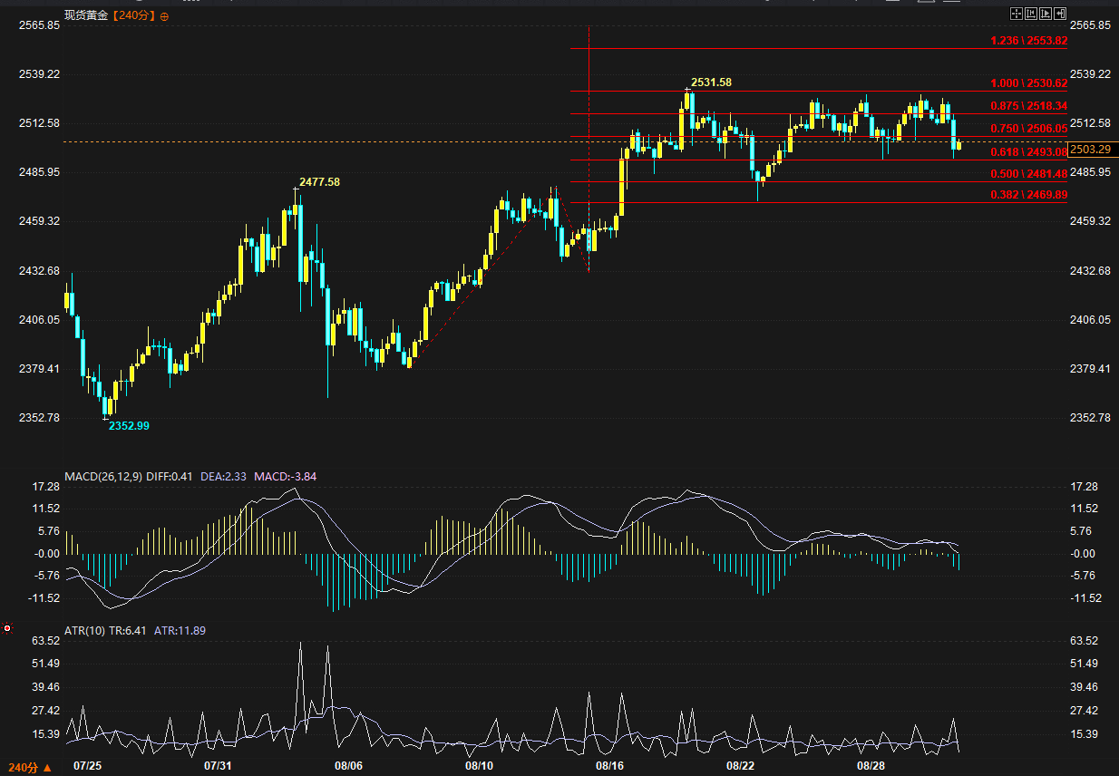 现货黄金8月29日(上周五)收阴结束并稍稍收于日图粉红线下方,但价格在最低点与8月27日低点形成双底形态,且周末前出现反弹迹象,表明接下来节奏轮到多头上演主场。我们可以从4小时图级别更精细地观察到这一现象:金价不仅在2493附近形成双底,而且还出现了阳孕线。接下来,金价守稳2504一线的情况下,多头接下来目标将依次是2512-2515区间,然后是2526-2528区间,然后是2531。