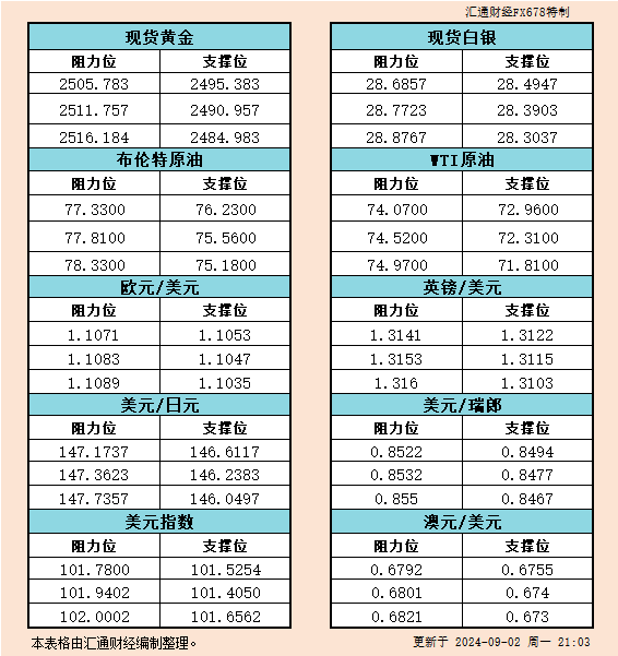 标题:9月2日美市支撑阻力:金银原油+美元指数等六大货币对