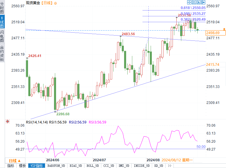 现货黄金价格微跌至2498.39美元/盎司,日内最低触及2489美元/盎司。上周五金价曾大跌近20美元,受美国7月消费者支出大幅增长的推动,市场对大幅降息的预期受挫。