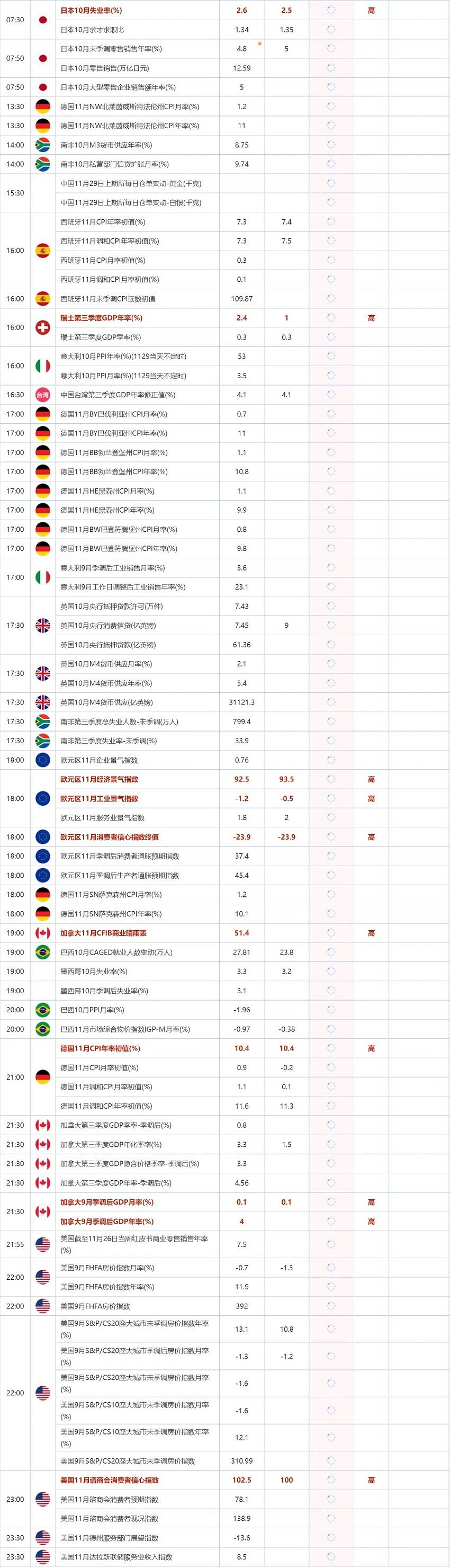 11月29日,投资者需要关注的重点数据:日本10月失业率 ,欧元区11月经济景气指数,欧元区11月工业景气指数,欧元区11月消费者信心指数终值,德国11月CPI年率初值,加拿大9月季调后GDP月率,美国11月谘商会消费者信心指数。 需要关注的大事件包括欧洲央行副行长金多斯发表讲话, 英国央行货币政策委员曼恩发表讲话,英国央行行长贝利在上议院做证词陈述。