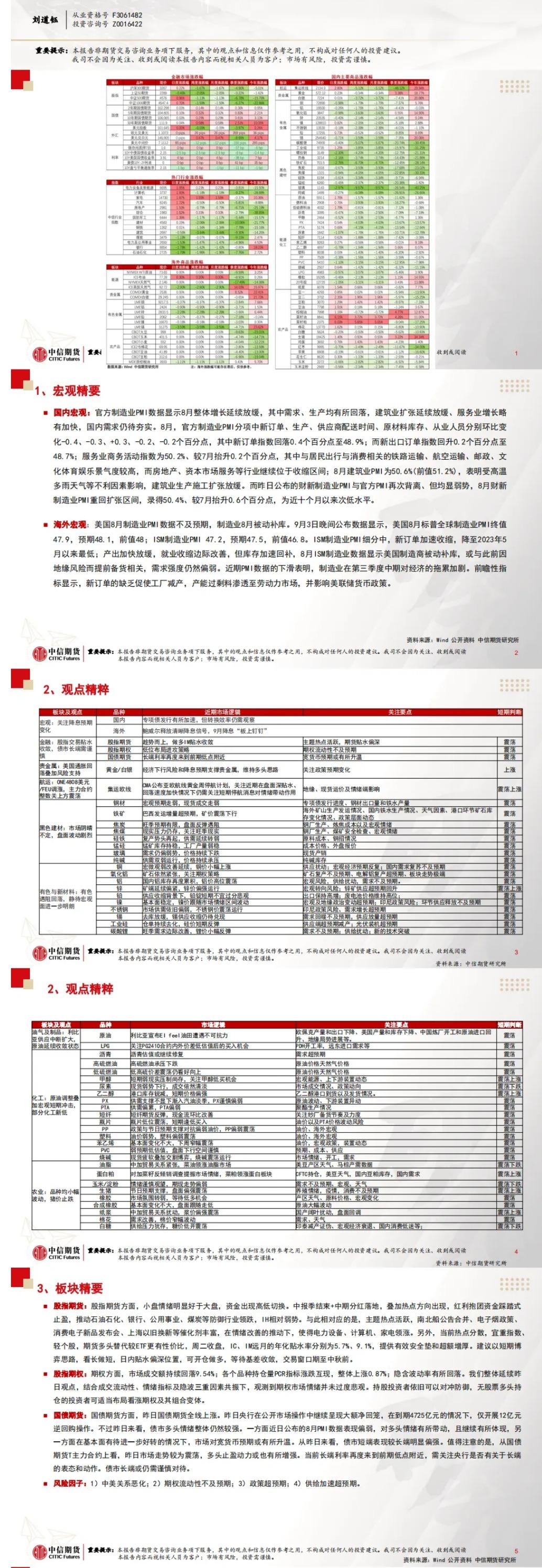 标题:中信期货9月4日晨报:美国8月制造业PMI弱于预期,商品普遍大跌