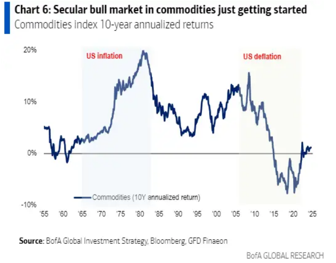 美国银行表示,大宗商品可能产生 11% 的年化回报率,“因为债务、赤字、人口结构、逆全球化、人工智能和净零政策都会带来通胀”。
