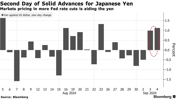 日元元兑美元周三(9月4日)飙升逾1%,美国就业市场降温的新迹象支持美联储在未来几个月更大幅度降息的理由。