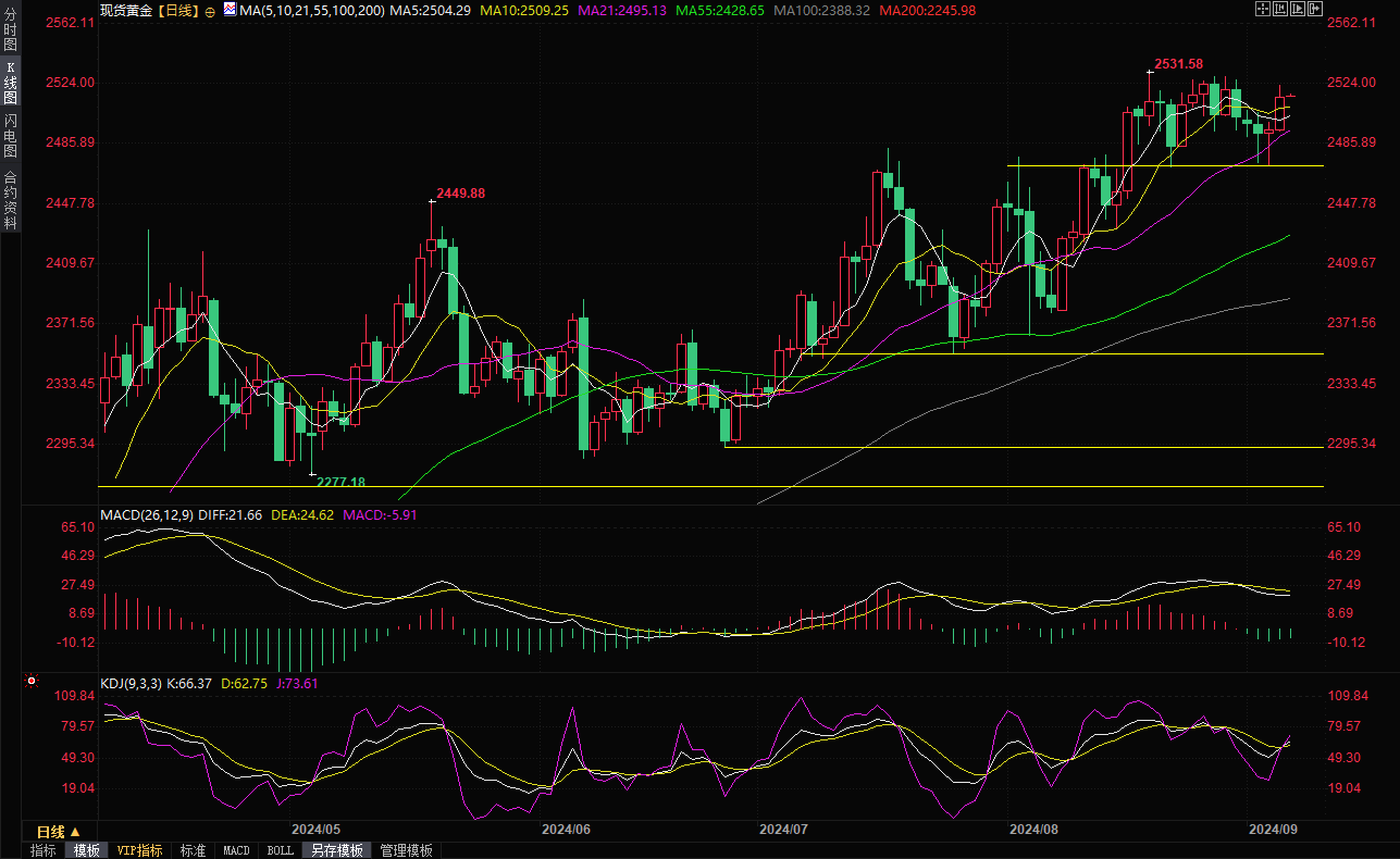 技术面来看,金价在布林线中轨附近获得支撑后再度走高,不仅收复了2500关口,而且该收复了5日均线和和10日均线,短线看涨信号有所增强,需要提防金价再度刷新历史高点的可能性。但MACD绿色柱仍在,金价仍留有高位震荡筑顶的可能性,需要提防金价冲高回落的可能性,分别关注10日均线2509.27和5日均线2504.33附近支撑。
