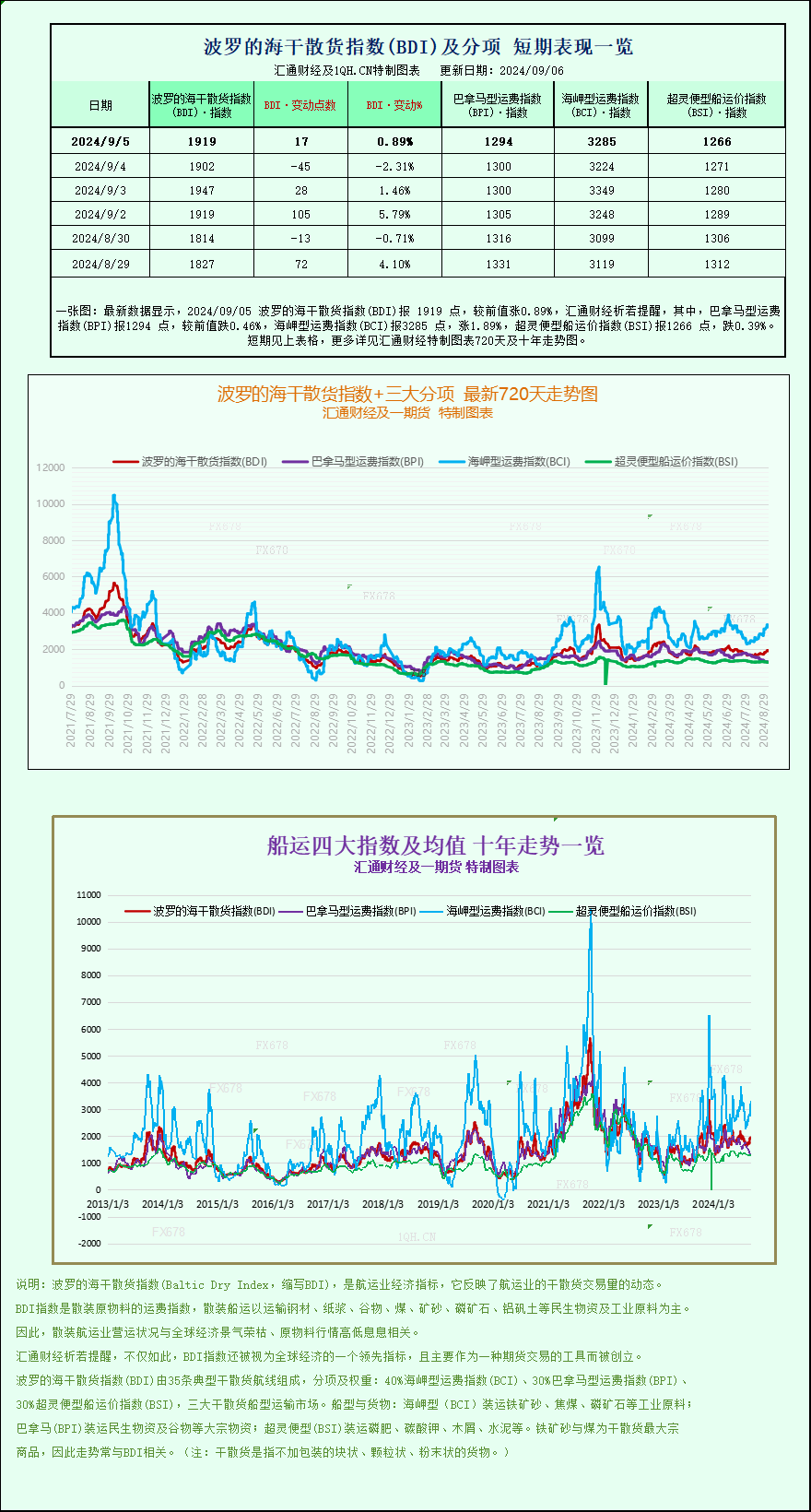最新数据显示,2024/09/05波罗的海干散货指数(BDI)报1919点,较前值涨0.89%,其中,巴拿马型运费指数(BPI)报1294点,较前值跌0.46%,海岬型运费指数(BCI)报3285点,涨1.89%,超灵便型船运价指数(BSI)报1266点,跌0.39%。波罗的海干散货指数+三大分项的最新720天走势图、十年走势图等详见汇通财经特制图表。