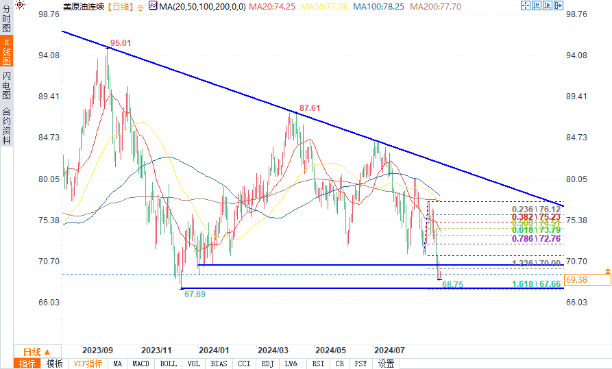 下行方面,8月5日的低点71.17美元已经被跌破。从这里开始,68.00美元的重要关口是第一个需要关注的水平,其次是67.11美元,这是2023年6月看到的三重底部的最低点。