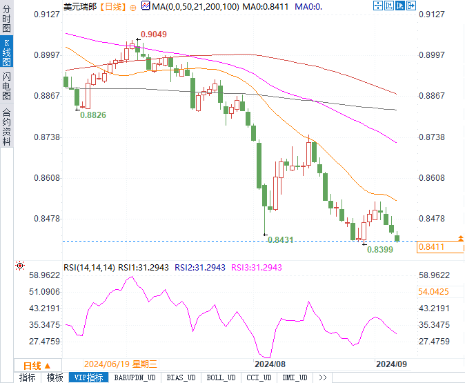 美元兑瑞郎的技术支持位在0.8400附近,若跌破这一水平,可能会进一步加剧美元的下行压力。