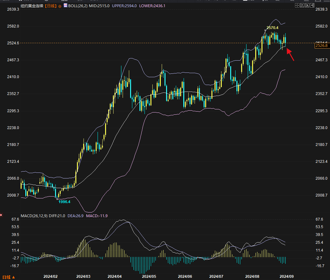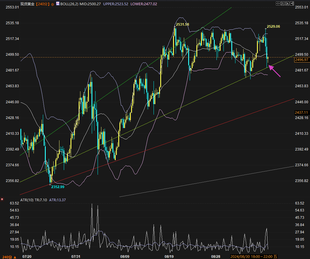 日线来看,上周金价的“下探--走强--回吐涨幅”节奏是围绕什么展开呢?如果仔细观察可以发现,答案就是“布林带中轨”:首先,9月3日周二价格的最低点2473刚好是布林带中轨切入位,9月4日周三价格依托布林带中轨启动反弹,并在周四进一步反弹到历史新高2531附近。然后9月6日周五的冲高后暴跌,有一层意思是回踩该布林带中轨。