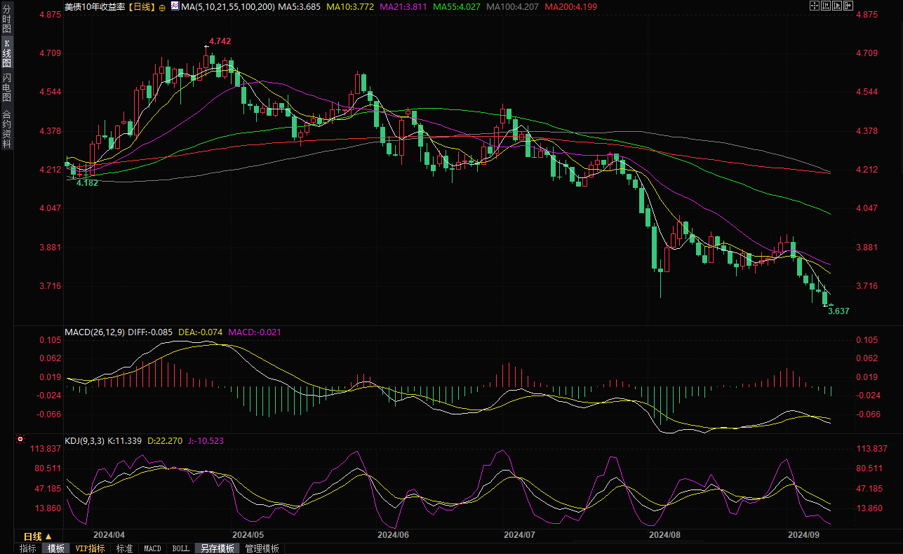 10年期收益率周二尾盘报3.644%,比周一低约5个基点,为2023年6月2日以来最低。两年期收益率为 3.61%,低了近六个基点,为2023年3月以来最低。这两个期限的利差超过三个基点,比周一陡峭。