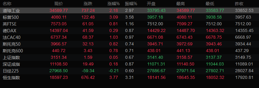 美股收盘情况:标普500指数跳涨3.09%,收报4,079.97点;纳斯达克指数大涨4.41%,报11468.00点;