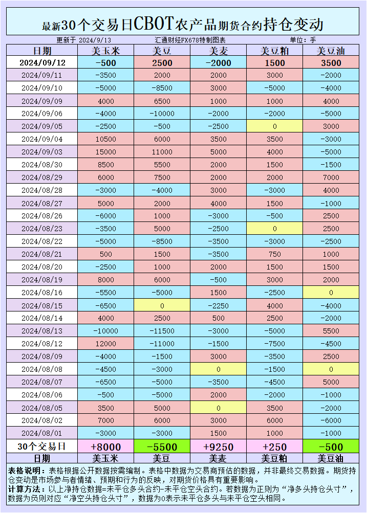 增加CBOT玉米投机性净多头;增加CBOT大豆投机性净空头;增加CBOT小麦投机性净多头;增加CBOT豆粕投机性净多头;增加CBOT豆油投机性净空头。