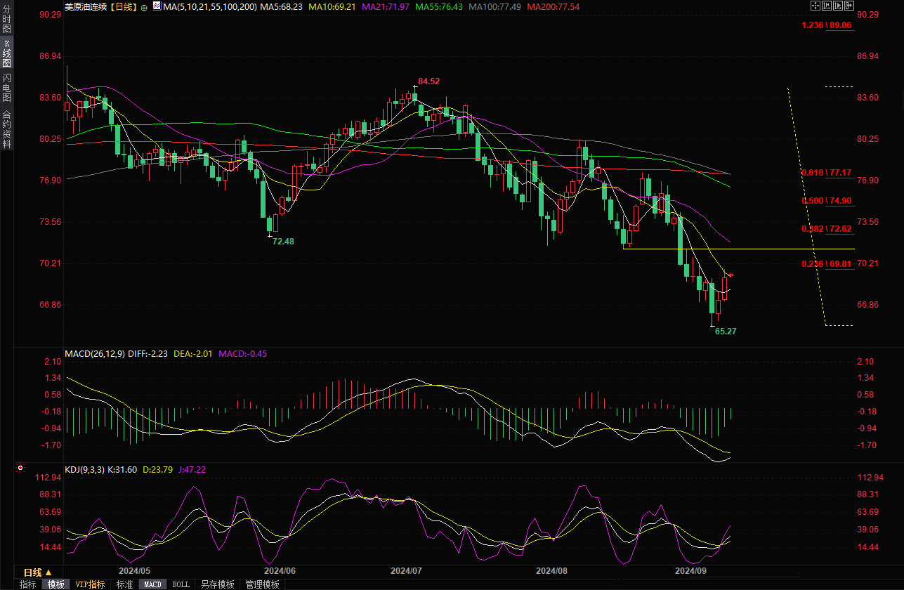 美原油守住了近三年低点支撑,并展开了反弹,削弱了后市看空信号,KDJ低位金叉运行,短线油价存在进一步反弹机会,初步阻力参考70关口和9月4日高点71.46附近位置;下方留意5日均线67.99附近支撑。