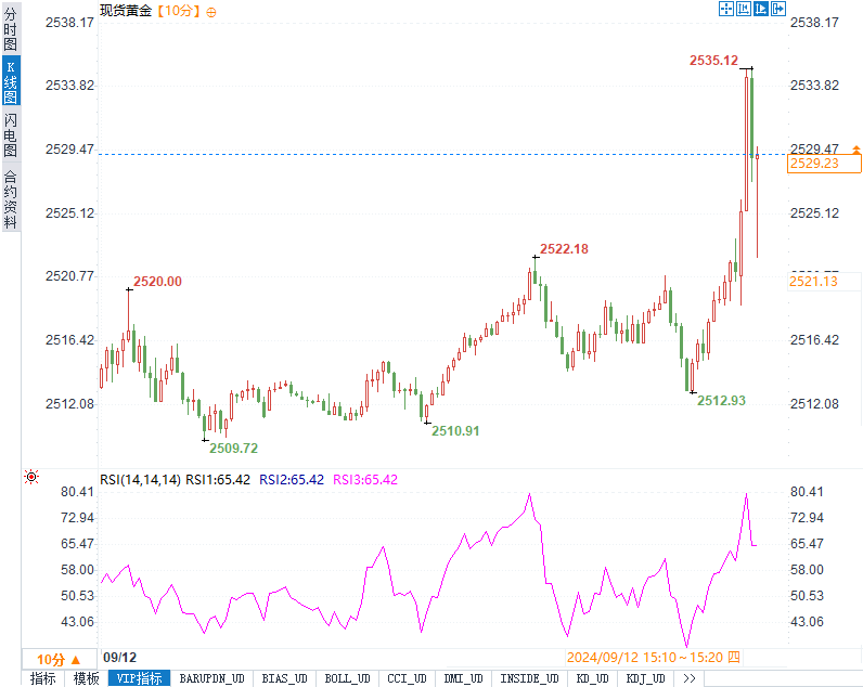 现货黄金价格强势上涨,突破2530美元/盎司关口,最高触及2535.25美元,创下历史新高,后回落,现报2530美元/盎司。随着美联储的宽松预期继续存在,黄金作为避险资产受到了投资者的青睐。与此同时,白银价格也走高,现报28.95美元/盎司,日内涨幅超过1%。