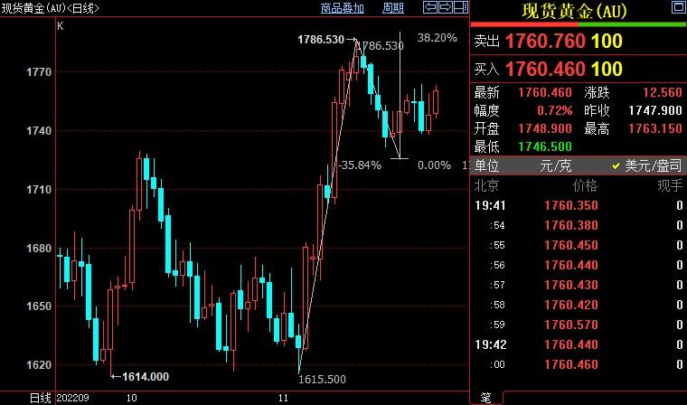 现货黄金上涨0.74%至1762.65美元/盎司;COMEX期金主力合约上涨0.75%至1776.9美元/盎司;