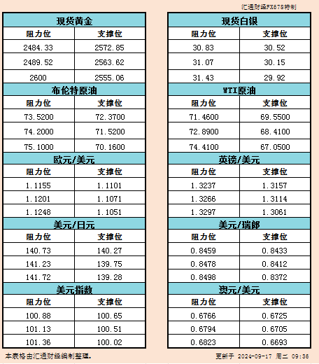 9月17日亚市支撑阻力:金银原油+美元指数等六大货币对