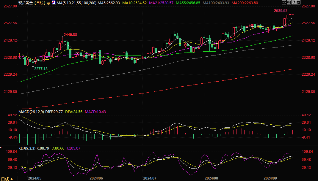 虽然高位出现了一些短线多单的获利了结,但金价收盘仍守在历史高位附近,周一收报2589.89美元/盎司。