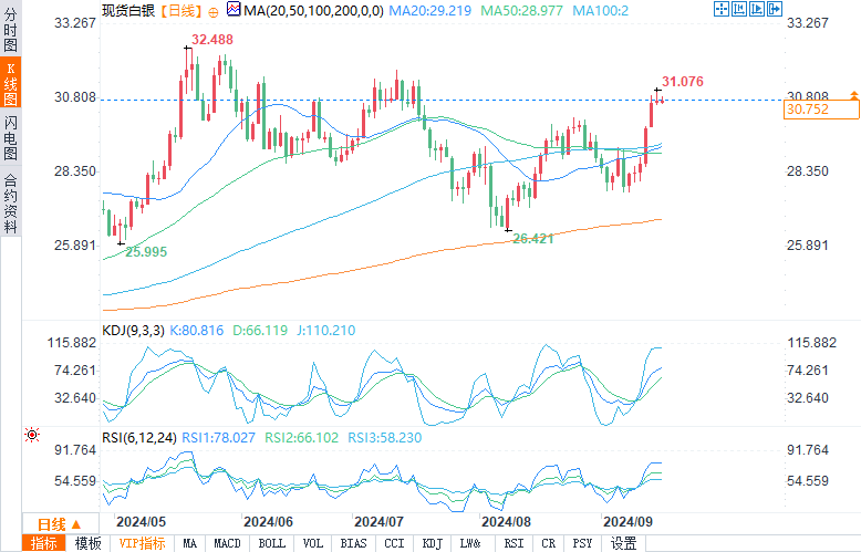 现货白银报30.743美元/盎司,涨幅0.10%。