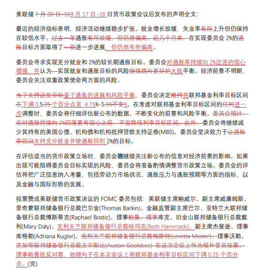标题:美联储9月17日-18日货币政策会议声明全文和近两次声明对比