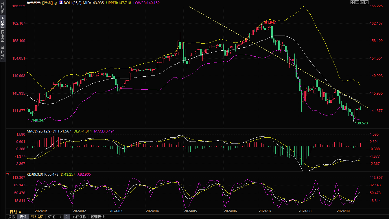 整体来看,美联储启动降息周期,市场预期日本央行本周利率不变,但日本央行行长可能维持鹰派离场,而且日本央行10月份可能会再次加息,偏向支撑日元。中东地缘局势紧张和美国大选不确定性也支撑日元的避险买需。技术面:日线级别,周四冲高回落,受到布林线中轨和21日均线阻力,暗示上方阻力较强,破坏了140下方以来的反弹走势。但MACDA和KDJ依然金叉,短线走势仍有变数留意5日均线142.02附近支撑。
