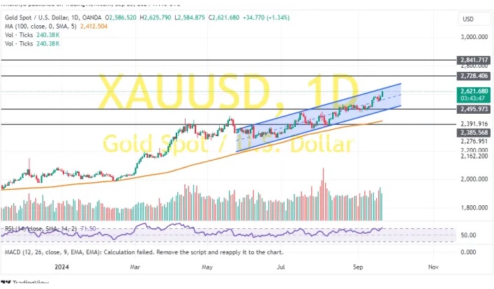 现货黄金周五收盘暴涨34.42美元,涨幅1.33%,报2620.91美元/盎司。金价周五最高触及2625.81美元/盎司,创下历史新高。