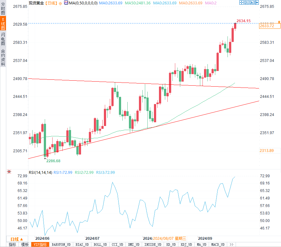 现货黄金突破2630.00美元/盎司关口,再度刷新历史高位最新报2633.42美元/盎司,日内涨0.46%。
