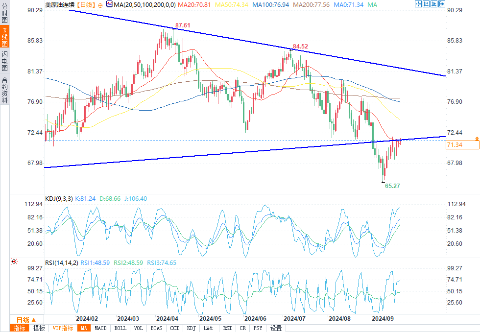 油价受益于美联储降息,美国供应下降美联储上周大幅降息50个基点,帮助稳定了包括原油在内的风险资产,此后油价小幅走高。此外,飓风弗朗辛造成的美国原油供应暂时减少,为市场提供了支撑,尽管人们对需求减弱的担忧仍在继续。