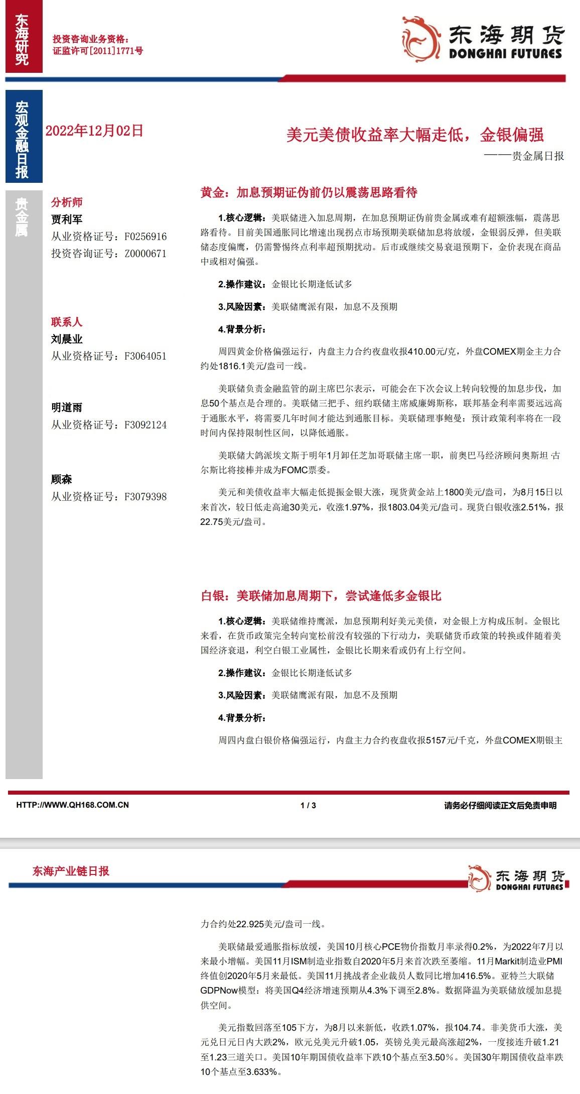 标题:【东海期货12月2日产业链日报】贵金属篇:美元美债收益率大幅走低,金银偏强