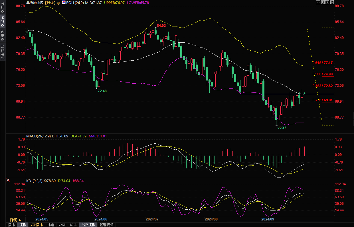 美原油目前交投于71.50美元/桶附近。油价周二攀升约2%,触及三周最高,因世界第一大原油进口国亚洲大国将采取货币刺激措施,而且人们担心中东日益加剧的冲突或将影响该地区的供应,此外,OPEC上调中长期全球石油需求预测.