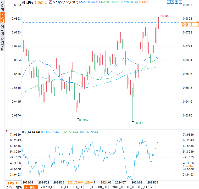 在大宗商品市场上,铁矿石作为澳大利亚最大的出口收入来源之一,对澳元的走势有着重要影响。大连铁矿石价格在9月24日上涨4.6%,反映出市场对中国经济复苏的预期增强。考虑到中国是澳大利亚最大的贸易伙伴,这种积极信号无疑对澳元形成了强劲支撑。