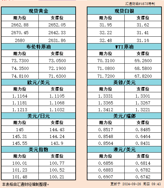 标题:9月26日亚市支撑阻力:金银原油+美元指数等六大货币对