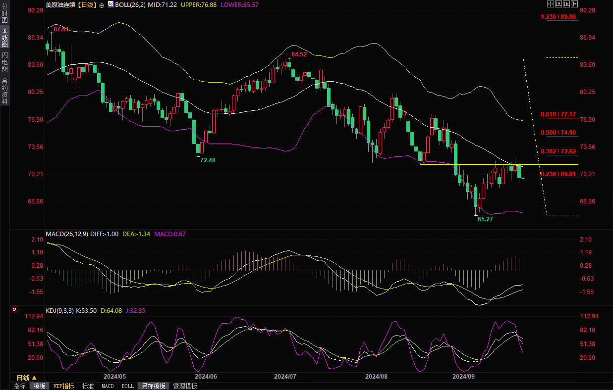 技术面来看,日线级别,美原油未能顶破8月21日低点71.46附近阻力,也受到布林线中轨的明显压制,KDJ重新结成死叉,油价回到所有均线下方,需要提防油价延续前期跌势的可能性,下方留意9月18日低点68.58附近支撑,若失守该支撑,则增加后市看空信号;上方布林线中轨阻力目前在71.22附近,若强势顶破该阻力,则增加后市看涨信号。