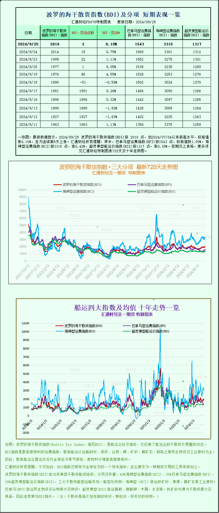 汇通财经APP讯——最新数据显示,2024/09/25波罗的海干散货指数(BDI)报2016点,创2024/07/04以来新高水平,较前值涨0.10%,且为连续第5天上涨。其中,巴拿马型运费指数(BPI)报1543点,较前值跌1.09%,海岬型运费指数(BCI)报3315点,涨0.42%,超灵便型船运价指数(BSI)报1317点,涨0.38%。波罗的海干散货指数+三大分项的最新720天走势图、十年走势图等详见汇通财经特制图表。