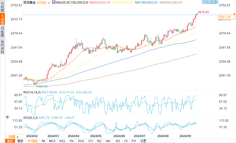 投资者预期美联储将进一步放宽货币政策,黄金继续获得支撑。在上次会议上降息50个基点之后,交易员现在预计下个月再次降息50个基点的可能性为58%。较低的利率通常有利于黄金,因为它降低了持有这种无收益资产的机会成本。几位市场分析师认为,到2024年底,金价可能轻松突破2700美元。