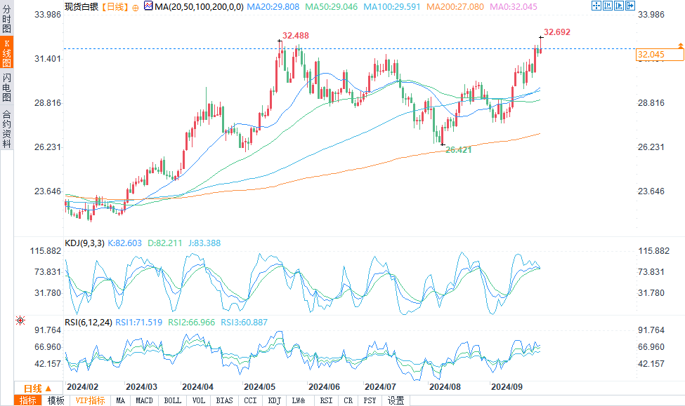 汇通财经APP讯——周四(9月26日)纽约交易时段,银价今日飙升至32.72美元,超过了之前的年度最高纪录32.52美元。如果目前的趋势继续下去,这种新的看涨势头将使多年来的高点34.35美元触手可及。